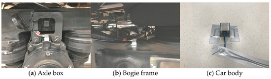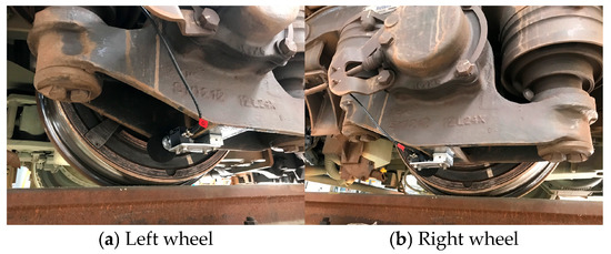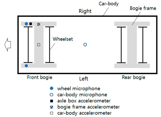 Figure 6 shows the positions of the vibration and noise sensors, while Figure 7 shows the noise sensors installed on the left and right wheels of the first axle in the direction of running. Additionally, to analyze the noise transmission path, vibrations were measured at key parts of the vehicle, including the axle box, bogie, and car body. As shown in Figure 8, accelerometers were installed on the right axle box and the upper side frame of the right bogie to measure the wheelset vibrations. Furthermore, accelerometers were installed on the floor of the car body above the front bogie to measure the car body vibrations. Table 5 presents the specifications and installation locations of the sensors.