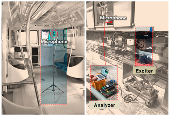 Figure 15 shows the setup used for testing the vibration and noise characteristics of the car body. An exciter was installed on the underframe of the car body, and the exciter and frame were connected using a stinger. An impedance head was installed at the end of the stinger on the underframe side to measure the input excitation force and response, and a frequency analyzer was used to test the natural frequency of the car body. Accelerometers and noise sensors were installed inside the vehicle to analyze the effect of car body excitation on interior noise. Table 7 lists the specifications of the car body noise characteristic test device.