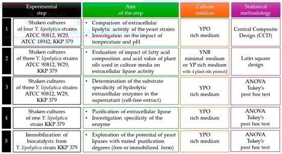 - Kebabci, Ö.; Cíhangír, N. Comparison of three Yarrowia lipolytica strains for lipase production: NBRC 1658, IFO 1195, and a local strain. Turk. J. Biol. 2012, 36, 15–24. [Google Scholar] [CrossRef]