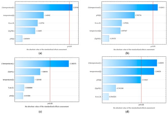 Pareto charts indicating significantly important factors influencing the extracellular hydrolytic activity of (a) Y. lipolytica ATCC 90812; (b) Y. lipolytica W29; (c) Y. lipolytica ATCC 18942; and (d) Y. lipolytica KKP 379. Abbreviations: L—linear effect, Q—quadratic effect, 1L wz 2L—the interaction of the effects.