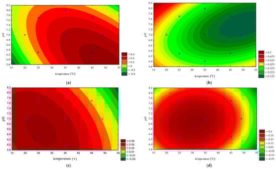 In the first stage of the current work, the influence of pH and temperature on extracellular lipase activity in a model reaction of p-nitrophenyl laurate hydrolysis was assessed. Within this part of the experiment, a Central Composite Design, with the two above-mentioned tested variables, was applied. The results, in the form of Pareto charts and contour plots with the response surfaces, are presented in Figure 2 and Figure 3, respectively.