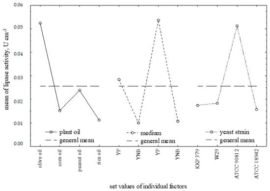 The effect of the yeast strain used, the type of plant oil in the culture medium, and the type of the medium were investigated in relation to the extracellular activity of lipases synthesized by Y. lipolytica yeast cells using a Latin square design. The results of the experiment are presented in the form of main effects plots in Figure 4. The analysis of variance of the experimental data showed no significant effect of the two factors, i.e., plant oil and yeast strain, on the extracellular hydrolytic activity and specific activity. Only the type of medium used was statistically significant.
