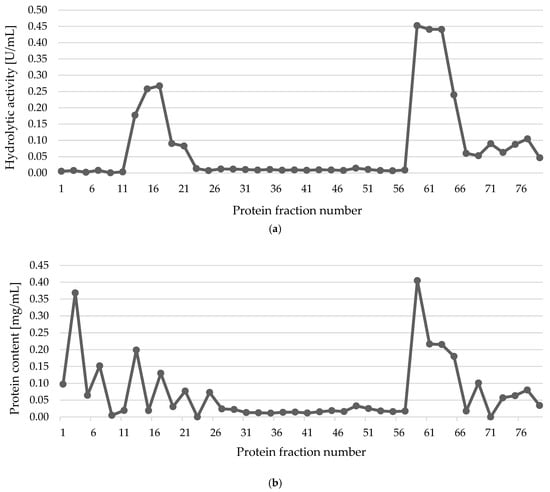 Analyzing Figure 6, two peaks, characterized by hydrolytic activity, can be observed. The first was for fractions 15–17, for which the hydrolytic activity was approx. 0.250 U/mL, and the second was for fractions no. 59–63, where an activity of about 0.450 U/mL was noted. It can be concluded that the purified supernatant contained enzymes with different charges, and the obtained electropherogram showed bands corresponding to sizes of approx. 30 and 40 kDa (Supplementary Materials, Figure S1). The molecular weight of Lip2p lipase is 38 kDa [], which may confirm the presence of this lipase in the supernatant of the KKP 379 strain and a second lower-molecular-weight enzyme, e.g., a protease, which is also secreted by this yeast, and has a molecular weight of 30 kDa [].