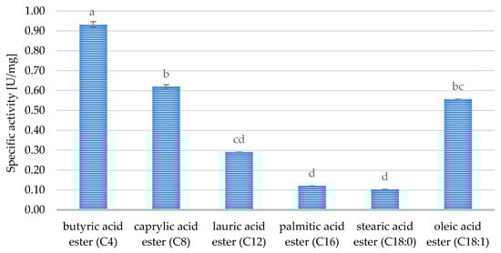 In an effort to prove that it is a “true” lipase, we decided to conduct an additional experiment in which the specific activities of the extracellular lipase from Y. lipolytica KKP 379 (fraction 60) towards different fatty acids esters of p-nitrophenol, i.e., butyric, caprylic, lauric, palmitic, stearic, and oleic acids esters, were determined (Figure 7).