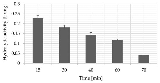 Intracellular enzymes, namely cell-bound ones and those from the cytosol, showed a very high enzymatic activity of 146.70 U/g (Table 4). As a result of cell disintegration using the glass beads, the cell structure was damaged, and the enzymes were released into the solution, which is reflected in the reduced activity of the yeast biomass after disintegration (54.02 U/g) compared to the initial state. This is also confirmed by the activity of the supernatant obtained after the disintegration process, which also showed a hydrolytic activity of 0.37 U/mL. The preparation obtained by physical adsorption of the supernatant after the disintegration of cells on Lewatit VP OC 1065 resin also exhibited satisfactory hydrolytic activity, and 232.00 U/g was achieved. Enzymatic kinetics was also evaluated for crude extracellular lipase immobilized on the support (Figure 8). It was revealed that the enzymatic preparation retained 50% of its activity after 60 min of the hydrolysis reaction, in comparison to the activity measured after 15 min (80% after 30 min and 63% after 40 min).