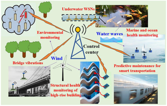- Fan, X.; He, J.; Mu, J.; Qian, J.; Zhang, N.; Yang, C.; Hou, X.; Geng, W.; Wang, X.; Chou, X. Triboelectric-electromagnetic hybrid nanogenerator driven by wind for self-powered wireless transmission in Internet of Things and self-powered wind speed sensor. Nano Energy 2020, 68, 104319. [Google Scholar] [CrossRef]