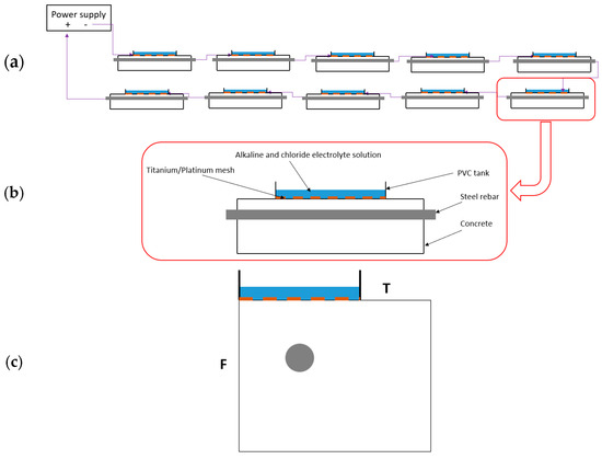 The accelerated corrosion of the carbon steel rebar was performed using the impressed current mode [38,42,43]. This type of method has been reported in numerous previous studies and has proved its effectiveness and relevance [7,14,17,18,19,20,21,22]. Figure 2 presents the experimental setup. The current density between the rebar and the platinum mesh was controlled by a power supply (Agilent 6614C, Agilent Technologies, Les Ulis, France, 100 V, 0.5 A) where the positive and negative poles were, respectively, connected to the rebar and the mesh. The platinum mesh (275 mm long, 75 mm wide) was placed into a bottomless PVC tank glued (a cyanoacrylate-type mastic was applied) on the centre of the top face of the RC prisms (Figure 2). The length of rebar that is considered to be corroding is the length of the platinum mesh. Therefore, the surface area of the carbon steel rebar was equal to 172.8 cm2. For each current density, the RC prisms were connected in series. For illustrative purposes, an example is shown in Figure 2a.