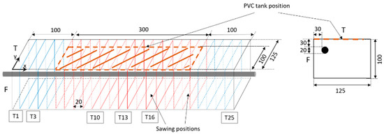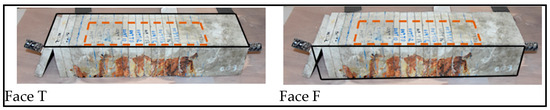 Slices 20 mm thick were drawn along the longitudinal X direction on prisms that had been marked with an asterisk (Figure 4 and Figure 5 and Table 2). Each of the slices had been assigned a designation, ranging from T1 to T25 (Figure 4 and Figure 5). The slices were sawn with dimensions of 125 × 100 × 20 mm3. Slices T2 and T3 were considered as reference samples, as they were outside the accelerated corrosion test area. The slices from T10 to T17 were inside the accelerated corrosion test area. As expected, slices T2 and T3 exhibited no sign of corrosion and thus were excluded from the subsequent analysis. The total number of slices to be studied is therefore one hundred twelve.