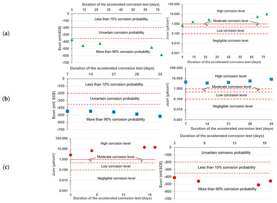 Half-cell potential (Ecorr) and corrosion current density (Jcorr) of the RC prisms versus duration of the accelerated corrosion test in the first and second columns, respectively. Data obtained using different impressed current densities: (a) 50 µA/cm2 (represented by green triangles), (b) 100 µA/cm2 (represented by blue squares), (c) 200 µA/cm2 (represented by red circles).