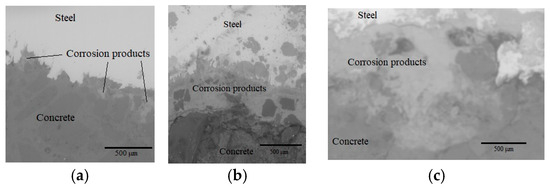 SEM images of the steel/concrete interface showing the thickness of the corrosion products layer for a total charge equal to 168 A.h/m2. (a) 50 µA/cm2 (P23-14d), (b) 100 µA/cm2 (P31-7d) and (c) 200 µA/cm2 (P14-3.5d).