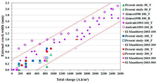 - Pedrosa, F.; Andrade, C. Corrosion induced cracking: Effect of different corrosion rates on crack width evolution. Constr. Build. Mater. 2017, 133, 525–533. [Google Scholar] [CrossRef]
