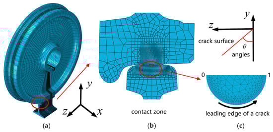 Figure 2b illustrates the network refinement diagram of the contact region, where the grid size near the contact region is set to 1 mm × 1 mm; in contrast, the grid size in regions further away from the contact area can be gradually increased to enhance computational efficiency. Figure 2c presents the schematic for crack surface insertion. To ensure calculation accuracy, adaptive mesh technology was employed to remesh the initial crack insertion region [30]; the smallest dimension of an element at a crack leading edge node is 0.1 mm. At the leading edge of the crack, there is an inner ring of 15-node singular wedge cells, consisting of 600 nodes and 400 cells, and an outer ring of 20-node hexahedral cells, consisting of 45,920 nodes and 2296 cells. In the region surrounding the crack, 10-node tetrahedral cells are used, totaling 4,010,380 nodes and 401,038 cells. Additionally, 8-node hexahedral cells, totaling 2,907,848 nodes and 363,481 cells, are used further away from the crack’s surface.