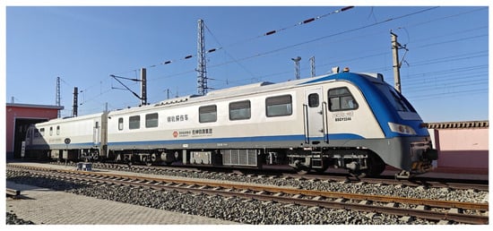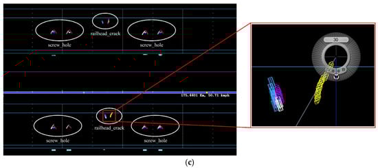 The rail flaw detection car, mounted on the track, is a specialized train used for detecting rail damage (as shown in Figure 3). This train employs ultrasonic methods for rail damage detection, capable of identifying fatigue cracks in the rail head and rail waist areas. The detection system, illustrated in Figure 4, uses ultrasonic technology to collect data via a probe wheel [32]. The real-time A-scan waveforms are displayed, and the data are converted into B-scan images. These B-scan images can be reviewed to assess the internal damage to the rail, helping to determine the extent and angle of fatigue crack propagation.
