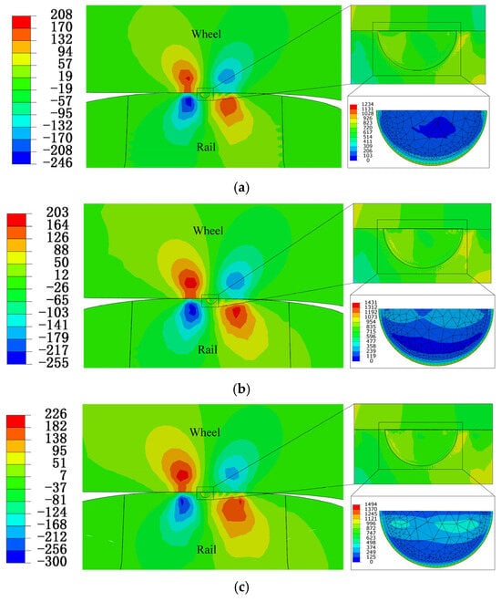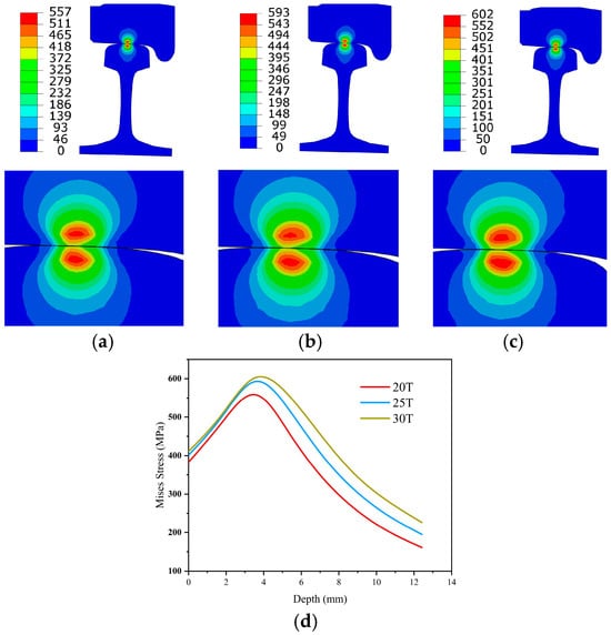 The Von Mises equivalent force assignments across the rolling contact region at the wheel–rail interface is illustrated in Figure 6a–c. During the rolling contact, a localized concentration of equivalent force occurs near the contact point. Under axle weights of 20 T, 25 T, and 30 T, the equivalent force at the rail surface exhibits a gradual increase, with maximum stresses recorded at 557 MPa, 593 MPa, and 602 MPa, respectively. This indicates that as axle weight increases, the equivalent force on the rail also intensifies, thereby elevating the likelihood of crack formation and degrading the rail’s performance. Figure 6d illustrates the distribution of an equivalent force along the depth of the rail tread. Notably, at the positions where the stresses are at their maximum cross-section, the equivalent force in the rail is approximately 3 mm from the tread, reaching its maximum value [33].