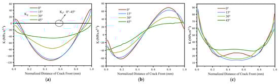 To facilitate clarity in description, the positions of the crack leading edge nodes are normalized, establishing a reference point at a normalized distance of zero and extending to a normalized distance of one, which delineates the boundary surrounding the crack leading edge node. Figure 8a,b illustrates the assignments of the SIF as a function of the normalized range at the crack tip, considering various initial cracking angles.