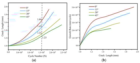 The propagation lengths of fatigue cracks, determined for various initial crack angles, are calculated utilizing the most efficient pathway of crack propagation. The correlation is between the crack extension length and the counts of load cycling for four various initially cracked angles. The measured crack extension lengths were 1.64 mm, 1.47 mm, 1.31 mm, and 1.23 mm for initial crack angles of 0°, 15°, 30°, and 45°, respectively, at a cycle number of 1.5 × 105. This observation underscores the significant impact of the initial crack angles upon the fatigue crack propagation life. Within the angular range of 0° to 45°, an increasing amount of load cycling and accelerated crack expansion rate leads to a transition from a stable propagation phase to an unstable one. Furthermore, at a consistent number of cycles, a decrease in the initial crack angle correlates with a heightened susceptibility to crack propagation behavior. Based on Figure 9a, an analysis was conducted to elucidate the correlation that exists between the crack extension length and the corresponding count of fatigue cycles to derive the rate of crack extension along the extension path. Figure 9b illustrates the rate of crack extension versus crack extension length, specifically for cracks with varying initial propagation angles along the optimal propagation path. Upon entering the propagation stage, the crack exhibits a rapid increase in its propagation rate. After approximately 0.2 mm of propagation, it transitions into a stable propagation phase, during which the propagation rate progressively decreases. As the initial crack angle increases, there is a gradual decrease in the crack propagation rate, accompanied by a corresponding reduction in the length of crack propagation. This observation suggests that the larger initial crack angle is associated with a reduced rate of crack propagation and an extended lifespan of the rail.