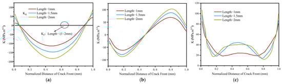 As indicated in Figure 10b, the values exhibit a centrosymmetric distribution, wherein both the maximum and minimum values progressively increase with the initial crack length. Furthermore, the values of at both extremities of the crack leading edge node approach zero. Under identical operating conditions, the largest values consistently remain smaller than the largest values. Figure 10c illustrates the distribution for equivalent stress strength factor in the crack leading edge node for varying initial crack lengths. It is observed that the maximum values of all initial crack sizes are situated at the ends of the crack leading edge nodes, whereas the values approach a decrease before rising as one moves toward the center. The maximum value of the equivalent stress strength factor at the crack leading edge increases as the initial crack length increases. This observation suggests that larger initial crack sizes render the crack more susceptible to propagation behavior, particularly at both the terminal and central regions of the leading edge.