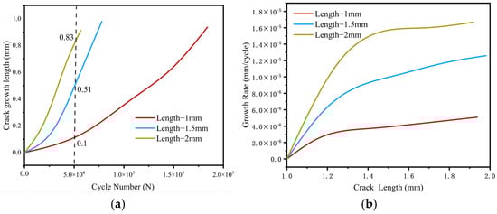 Crack propagation at different initial crack lengths: (a) crack propagation length; (b) crack propagation rate.