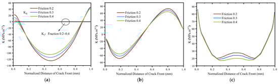 Crack tip stress intensity factor at various friction coefficients: (a) ; (b) ; (c) .