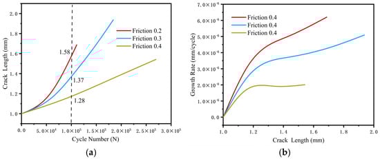 The lengths of fatigue cracks, evaluated across various initial friction coefficients, are calculated based on the most rapid propagation paths of crack growth. Figure 13a illustrates the relation of crack extension length with the number of loading cycles, considering three distinct friction coefficients. When the friction coefficients are set at 0.2, 0.3, and 0.4, the corresponding crack propagation lengths are 1.58 mm, 1.37 mm, and 1.28 mm, respectively, under a load cycle of 1 × 105. It is evident that as the coefficient of friction increases, the crack propagation distances decrease for the same number of cycles. This observation suggests that a higher friction coefficient effectively inhibits crack propagation. Figure 13b illustrates the correlation between the propagation rate and the crack propagation length across varying friction coefficients. An analysis of Figure 13b reveals that the crack propagation rate exhibits a decreasing trend as the friction coefficient increases. Moreover, a larger disparity in the crack propagation rate correlates with a reduced number of cycles necessary to achieve the stable propagation stage. This occurs because higher friction coefficients result in increased stress requirements for crack propagation, thereby rendering the cracks less susceptible to propagation.