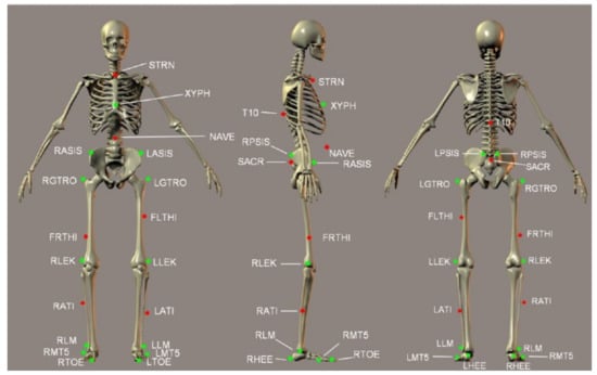The front, side, and rear views of the marker configuration used in the Human Body Model are presented. The green markers indicate the anatomical reference points used to define the skeleton during the initialization process, as follows: XYPH—the xiphoid process of the sternum, LASIS and RASIS—the left and right anterior superior iliac spine, LPSIS and RPSIS—the left and right posterior superior iliac spine, LGTRO and RGTRO—the left and right greater trochanter, LLEK and RLEK—the left and right lateral epicondyles of the knee, LLM and RLM—the left and right lateral malleolus of the ankle, LMT5 and RMT5—the left and right fifth metatarsal, LTOE and RTOE—the tips of the left and right toes, LHEE and RHEE—the left and right heels. Additional markers, which are technical markers providing redundancy and robustness for the model, included the following: STRN—the jugular notch of the sternum, NAVE—the navel, T10—the 10th thoracic vertebra, SACR—located midway between the LPSIS and RPSIS points, FLTHI and FRTHI—the left and right lateral thigh (positioned halfway between the greater trochanter and the lateral knee epicondyle), LATI and RATI—the left and right lateral shank (placed halfway between the lateral knee epicondyle and the lateral malleolus).