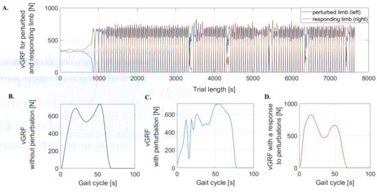 An example of the vertical component of ground reaction force (vGRF) for a single participant. (A) The vGRF for the perturbed limb and the responding limb during a trial in which perturbations occurred every ten seconds during the pre-swing phase; (B) the vGRF in the absence of perturbations; (C) the vGRF illustrating the presence of perturbations; and (D) the vGRF displaying the response to the perturbations.
