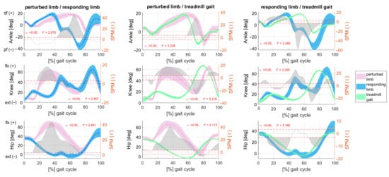 Following the SPM analysis, it was shown that there are statistically significant differences for all analyzed kinematic and kinetic parameters between the gait cycles for the perturbed limb, the reactive limb, and the treadmill gait (Figure 5).