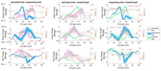 The second stage involved evaluating whether joint angles and torque curves differed between the treadmill gait and the perturbed and responsive limbs. This step employed ANOVA and non-parametric post-hoc tests using statistical parametric mapping (SPM) []. The SPM1D package (https://www.spm1d.org, accessed on 29 September 2024) was used for the analysis. For each SPM ANOVA, a statistical parametric map, SPM{F}, was generated by calculating the univariate F-statistic across the gait curve []. When the SPM{F} exceeded the threshold for a 0.95 confidence level, post-hoc SPM{t} maps were created to compare individual pairs of variables. Significant differences between motion tasks were identified when the SPM{t} map crossed the critical threshold.