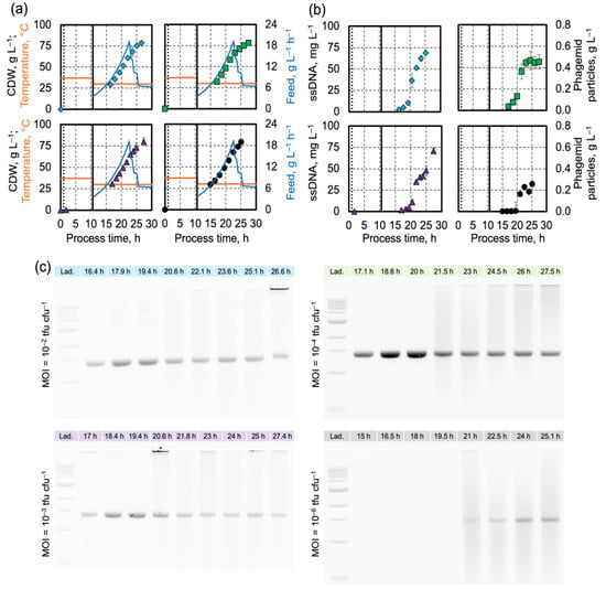 High-cell-density cultivation of Escherichia coli JM109 pfhp30 in a 2.5 L stirred tank bioreactor at 37 °C with temperature shift to 30 °C at the beginning of the feeding (indicated by the vertical black line). One hour after inoculation, cells were infected with phagemid particles (CSF1_4843) with various infection densities. Blue diamonds: MOI = 10−2 tfu cfu−1. Purple triangles: MOI = 10−3 tfu cfu−1. Green squares: MOI = 10−4 tfu cfu−1. Black circles: MOI = 10−6 tfu cfu−1. Error bars refer to the standard deviations of triplicates in measurements. (a) Cell dry weight concentration and temperature (black dashed line: infection time). (b) ssDNA concentration was calculated from the measured absorbance at 260 nm. (c) AGEP of the ssDNA (scaffold) produced in the cultivations.