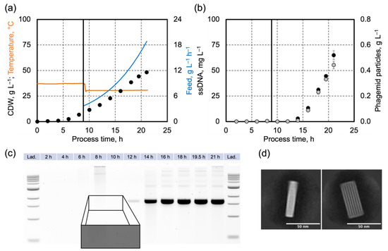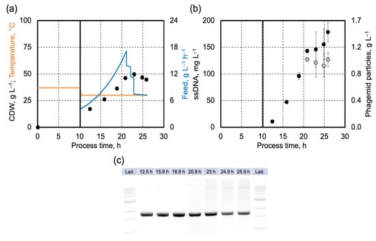 The fed-batch process data, including cell dry weight concentration, temperature, feeding profile, and ssDNA concentration, isolated from samples and applied to agarose gel electrophoresis are shown in Figure 4. The total process run time was reduced to 21 h. As shown before, impurities were observed after 21 h when the E. coli cells moved to the stationary phase. The reduced process time should lead to fewer DNA impurities and facilitate product purification.