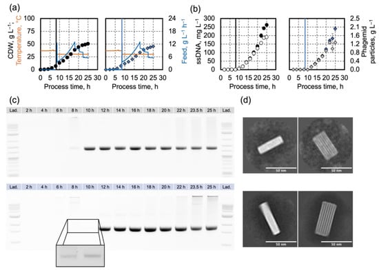 The infection strategy with phagemid particles CSF1_4843 and CSF1_6106, was transferred to a 25 L scale. Figure 3 shows cell dry weight concentration, temperature, feeding profile, and ssDNA concentration against the process time and agarose gel electrophoresis of ssDNA isolated from samples of both cultivations. The initial glucose (20 g L−1) was consumed after 8.18 h (cultivation infected with CSF1_4843 phagemid particles) and 8.53 h (cultivation infected with CSF1_6106 phagemid particles), respectively. During the feeding phase, glucose was pumped into the stirred tank bioreactor according to an exponential profile. After 9.8 h, the feeding was lowered to constant pump rates to prevent oxygen limitation of the E. coli cells. With the exponential feeding, the cell dry weight concentration also rose exponentially. The rise in the curve flattened when the feeding was lowered to constant rates. Independent of the infection material, the cultivations showed a reduced cell dry weight concentration of 50.6 g L−1 (infection with CSF1_4843) and 45.5 g L−1 infection with CSF1_6106). The reduced cell dry weight concentration was consistent with the cultivation infected with CSF1_6106 shown in Figure 2. The cell dry weight concentration was much lower than in the cultivations in Figure 1, infected with CSF1_4843 phagemid particles.