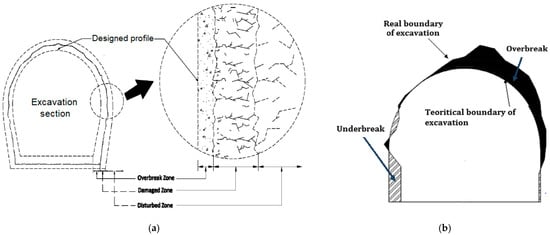 Excavation overbreak not only decreases stability and safety but also raises construction costs to a certain degree. It is one of the factors reducing the advance rate of excavating, leading to the formation of weakened zones with fall of ground, and ultimately to an increase in the costs of ground support and the hauling of excess rock mass [,,,,,,]. Hence, controlling overbreak in underground excavations is critical for economic and safety reasons.