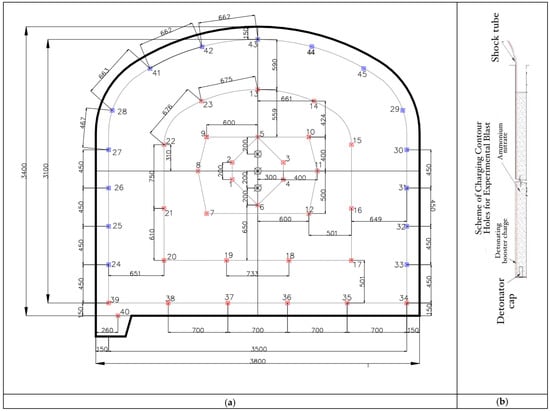 Blasting passport description: (a) blast holes layout (blue marks and red marks are the contour and stopping holes, respectively); (b) charging of the contour holes.