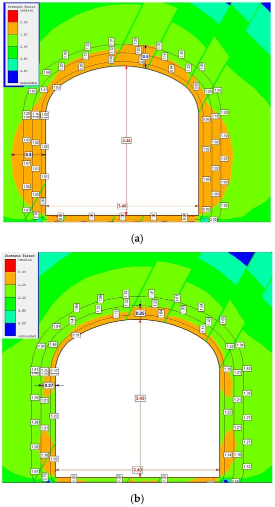 Numerical simulations of the stress states around the excavation cross-section (3.40 m × 3.45 m) with the conventional method of blasting (Figure 3a) were performed. The results were used to identify the possible damaged zones, which are given by a strength factor of less than 1. As it can be seen, the damaged zones in the roof area, reaches it maximum right in the middle of the excavation roof up to 0.5 m. This indicates that a depth of failure of 0.5 m in the roof due to blasting is likely to occur. Conversely, when the proposed contour blasting design is used (Figure 3b), and when using contour blasting, the failure depth is reduced by half (0.25 m), indicating an increase in the stability of the contour. Therefore, it can be stated that in a competent rock mass with few joint sets, the implementation of contour blasting is recommendable in terms of minimizing the overbreak due to the reduction in the failure depth around the excavation. In addition, it reduces the costs of secondary dilution and ground support.