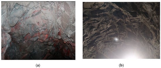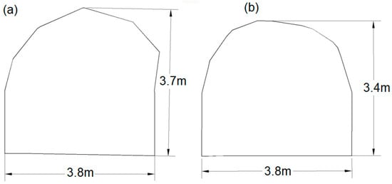 Figure 4 provides an example of the actual surveyed cross-sections of excavations corresponding to the standard blasting design (Figure 4a) and the charging contour blast holes proposed in this study (Figure 4b). The observations indicated that the actual cross-sectional area of excavations using the conventional method of blasting was equal to 14.1 m2, while the cross-sectional area of the proposed design was 12.0 m2. As shown in Figure 4a, the conventional blasting method results in fracturing and failures in the roof and walls of the excavation, leading to an increase in the excavation overbreak (excess section ratio) of at least 17.5%. Meanwhile, Figure 4b shows an average overbreak of less than 5% in the contour blasting, suggesting a close alignment between the excavation’s contour and the designed excavation profile.