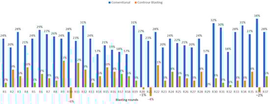 This contour blasting design was further tested, and experimental blasting was carried out in two excavations (development drifts) in two adjacent sublevels with a cross-section of 9.0 m2. The rock mass properties were identical for both excavations. The upper blasting was carried out in the conventional way, and the lower excavation used contour blasting. A total of 37 blast rounds from each design approach were carried out over 1.5 months. After each blast, the cross-section of the excavation was surveyed with a laser total station. The survey results are summarized in Figure 5. As can be seen, the cross-section of excavation with the conventional blasting method varied between 10.5 and 12.1 m2, indicating an overbreak between 17 and 34%. With contour blasting, the maximum actual cross-section of excavation that was observed was 10.2 m2 (or 13% of overbreak). For example, in the first blasting round (R1), the overbreak was 12% and 2% in the conventional (standard) blasting.