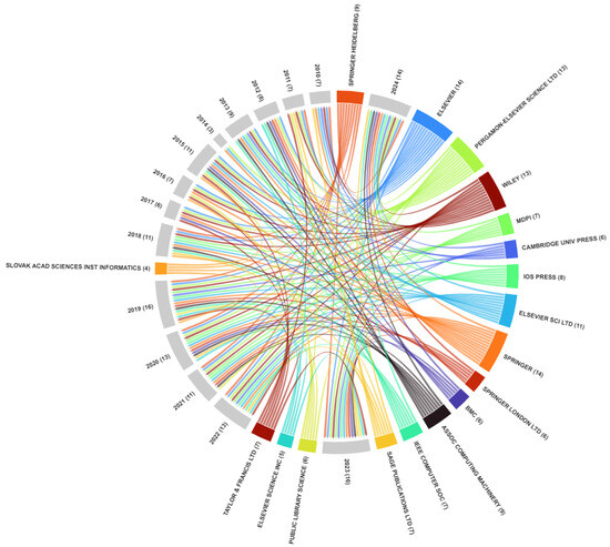 - Prominent Publishers: Springer and Elsevier are the most prominent publishers, indicated by their strong connections over multiple years. They have consistently published works across a wide range of years, demonstrating their significant presence in academic publishing.