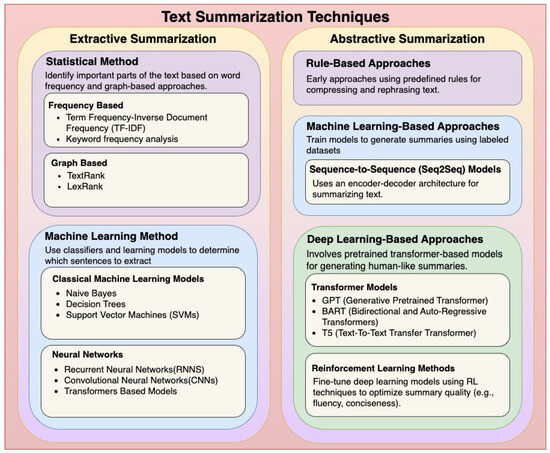 - Improved Abstractive Summarisation—Develop more coherent and semantically accurate abstractive models [55] that generate summaries closer to human-written content. Focus on reducing issues such as factual inconsistencies and hallucinations in summaries by integrating external knowledge bases.