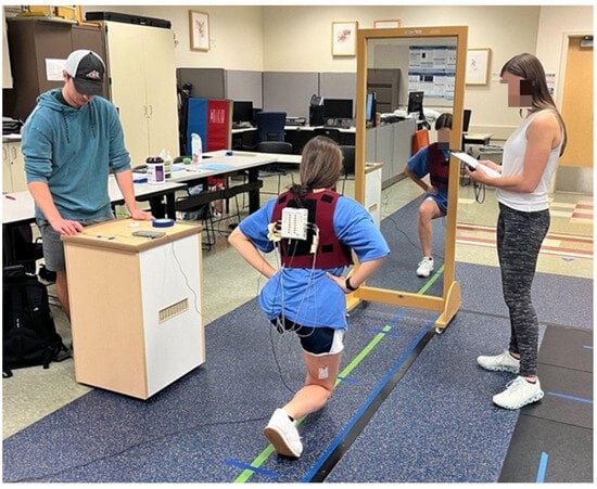 Prior to applying the electrodes, the skin was prepared by shaving (if necessary), abrading, and cleaning with alcohol to reduce skin impedance. EMG placement occurred in a private room and the participant was properly draped and covered to maintain modesty. Electrodes were placed on the muscles using Hypafix Cover Roll tape (Essity Medical Solutions, Charlotte, NC, USA) to secure them to the patient’s skin and to limit the amount of electrode movement artifact. The participants wore a vest with Velcro on the back to keep the EMG pack attached to the body during the lunge trials. Precise surface electrode placement was performed via SENIAM protocol, and real-time quality assurance of EMG data output was verified by a single member of the research team visualizing the activity on the computer screen as the patient voluntarily contracted and relaxed each muscle prior to data collection.