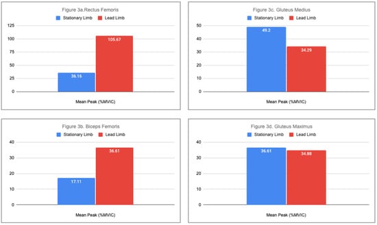 Figure 3 provides an analysis of the mean peak percent of MVIC muscle activity with respect to lead versus stationary limb revealing that the RF and BF had greater mean peak percent of MVIC muscle activations in the lead limb. GMed and GMax had greater mean peak percent of MVIC muscle activations in the stationary limb. RF peak muscle activation in the lead limb was 105.67% vs. 36.16% in the stationary limb (Figure 3a). BF peak muscle activation in the lead limb was 36.61% vs. 17.11% in the stationary limb (Figure 3b). GMed peak muscle activation in the stationary limb was 49.20% vs. 34.29% in the lead limb (Figure 3c). GMax peak muscle activation in the stationary limb was 36.61% vs. 34.88% in the lead limb (Figure 3d).