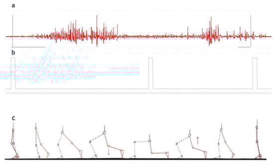 EMG data for both limbs were band-pass filtered (Butterworth high pass filter 10 Hz, low pass filter 300 Hz), rectified and smoothed (using root-mean squared [RMS] analysis), and normalized to MVIC using Motion Lab Systems EMG Analysis and Graphing software (https://motion-labs.myshopify.com/pages/software, accessed date: 4 April 2022) (Motion Lab Systems, Baton Rouge, LA, USA). RMS activity displays for each muscle in the lead and stationary limbs from which peak muscle activations were used to generate descriptive data. RMS is a sophisticated calculation that represents the mean power of the EMG signal. This is the preferred data analysis method for EMG smoothing and generally produces reliable results [15,16].