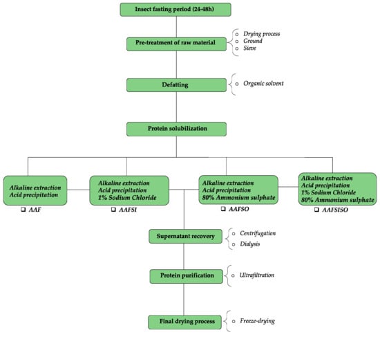 Four different methods were used to prepare BSF larvae concentrate (see Figure 1). The salt extraction isolates were prepared in accordance with the method of [14] with modifications. The previously described alkaline–acid extraction (AAF) method by [21] was employed with some adjustments.