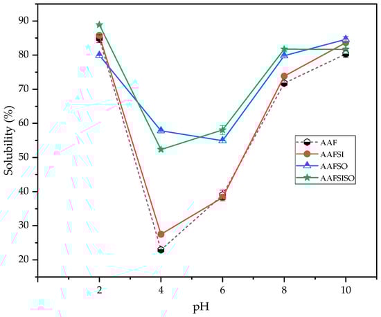 Protein solubility is a crucial factor that influences various functional properties, making it a critical determinant of protein functionality in the food-processing industry. The impact of pH and ionic strength on the protein isolates derived from BSF larvae was investigated, and the findings are illustrated in Figure 2. The solubility of the BSF larvae proteins followed a characteristic U-shaped curve within the examined pH range [2,3,4,5,6,7,8,9,10], indicating a substantial dependence on pH. The solubility of the AAFSO and AAFSISO proteins was significantly (p < 0.05) greater than that of the AAF and AAFSI proteins at pH 4–8 (Figure 2). The greatest levels of solubility were recorded at pH 2 (89% for AAFSISO) and pH 10 (85.21% for AAFSO), which were likely due to the attainment of the pI of protein bonds. These solubility patterns were consistent with those reported in previous studies [15,21,25]. Additionally, the results revealed that the BSF larvae isolates demonstrated remarkably enhanced solubility results at pH 2 compared to pH 8 and 10, with the exception of the AAFSO protein group. This finding aligns with prior research that reported enhanced Tenebrio molitor protein solubility at pH 2 compared to pH 10 [30].