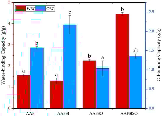 The capacity of a protein to bind water, known as water-binding capacity (WBC), is strongly linked to the texture, mouthfeel, and viscosity of food products [43]. Oil-binding capacity (OBC), which refers to a protein’s ability to retain absorbed oil, is also influenced by protein composition, pH, and ionic strength [30,44]. The values for the WBC and OBC of the BSF larvae proteins are illustrated in Figure 3. It is worth noting that the inclusion of NaCl salt did not produce a statistically significant change in the WBC of the protein, as shown by the results (p < 0.05). However, the AAFSISO demonstrated a higher WBC than the other proteins, although this difference was not statistically significant (p > 0.05). The variations in WBC across protein fractions were attributed to the amino acids outlined in the preceding work (not reported), which were impacted by the extraction method employed. To date, no research has been undertaken to investigate the WBC of BSF larvae proteins obtained through various salt-facilitated methods. The outcomes of this investigation surpassed the WBC values reported for BSF larval flour fractions in the previous literature (0.4–0.8 g/g) [15]. The highest WBC was found in the AAFSISO isolate (4.45 g/g), which significantly exceeded the WBC values of different insect species fractions documented in the literature, including Tenebrio molitor (1.87 g/g) [36] and Spodoptera gregaria (2.18 g/g) [30]. Similarly, the highest WBC was noted in the flour of Galleria sigillatus (2.34 g/g) and Spodoptera gregaria (2.18 g/g), which is likely due to the significant presence of hydrophilic amino acids (390.6 and 371.4 mg/g, respectively) [36]. These findings also suggest that BSF larvae have the potential to be a valuable ingredient in the food industry, as proteins with WBCs ranging from 1.49 to 4.72 g/g are recommended for use in viscous foods [45].