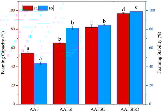 Effect of extraction methods on foaming capacity and stability of black soldier fly larvae isolates obtained by AAF (alkaline–acid extraction), AAFSI (salting-in technique), AAFSO (salting-out technique), and AAFSISO (salting-in and out technique). Various letters (a, b, c, d) point to noteworthy variations at p < 0.05. Error bars show standard deviation.