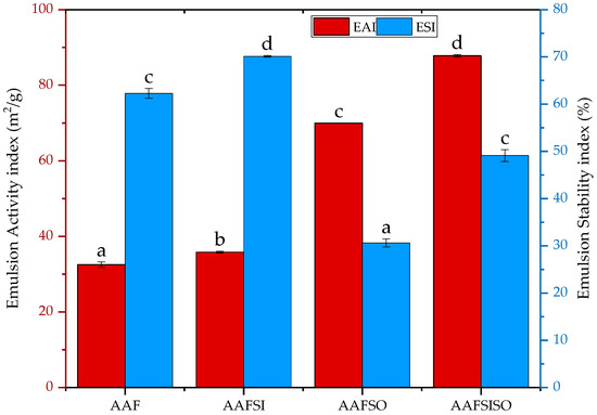 Effect of extraction methods on emulsion stability index and emulsion activity index of black soldier fly larvae isolate obtained by AAF (alkaline–acid extraction), AAFSI (salting-in technique), AAFSO (salting-out technique), and AAFSISO (salting-in and out technique). Various letters suggest notable contrasts with statistical significance at p < 0.05. Error bars depict standard deviation.