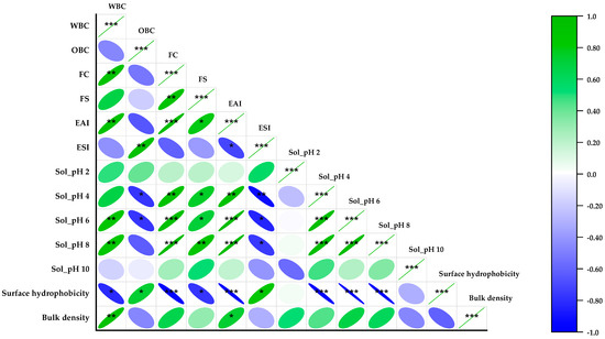 Correlation matrix between the black soldier fly larvae protein isolate functional properties via Pearson’s linear correlation analysis; the color gradation and the size of the circle represent the correlation coefficient (r value). Significance levels: * p < 0.05 (moderate significance); ** p < 0.01 (higher significance); *** p < 0.001 (highest significance); blue represents negative correlation; green represents positive correlation.