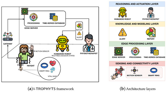 In this paper, we propose a novel concept for a smart motor rehabilitation system that leverages the convergence of IoT, Artificial Intelligence (AI), and Robotics, to improve healthcare sustainability, enable fine-grained patient monitoring and provide personalized diagnoses. We call this system I-TROPHYTS (https://site.unibo.it/itrophyts/en accessed on 1 December 2024), an acronym for IoT and humanoid RObotics for autonomic PHYsio-Therapeutic monitoring, coaching and supervision in smart Spaces. In our proposed scenario, patients are continuously monitored during physiotherapy sessions using wearable IoT sensors that capture both movement and physiological responses, such as heart rate and oxygen saturation already mentioned. At the same time, a humanoid robot partially takes over the role of the physiotherapist by imitating certain human behaviors. Based on the collected IoT data and domain-specific information, the robot can decide to start the next exercise in the motor routine, suggest alternative exercises, assign cool-down periods, or alert medical personnel in case of detected anomalies. By introducing controlled automation in this domain, I-TROPHYTS aims to enhance the overall sustainability of healthcare systems, as a single physiotherapist could supervise multiple patient groups simultaneously. Furthermore, by employing non-invasive IoT monitoring techniques together with edge-based processing [15,16], we can continuously track individual patient performance over time and identify correlations that could lead to personalized therapies. The use of humanoid robotics may also increase patient engagement due to its morphological similarities to humans [17,18]. However, realizing this concept requires the development of an innovative hardware/software framework with contributions spanning multiple fields, including IoT, knowledge representation and robotics. The I-TROPHYTS framework ensures IoT data acquisition from two types of wearable devices (IMU-based and vital-sign sensors), and integrates ML algorithms for exercise recognition and motion tracking. Moreover, it enables the representation of physiotherapy session data—including both patient states and domain-specific rules—via a uniform and unambiguous knowledge representation in the form of an ontology. This ontology facilitates reasoning and decision-making by the humanoid robot. To summarize, the key contributions of this paper are as follows: