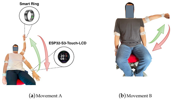 Data were collected using four ESP32 devices, two on each arm (one above and one below the elbow). In particular, the microcontroller, formally designated as ESP32-S3-Touch-LCD-1.28 and visible in Figure 3a, is a high-performance MCU board developed by Waveshare. It features an onboard 1.28-inch capacitive touch display, a Li-ion battery, and a six-axis sensor, comprising a three-axis accelerometer and a three-axis gyroscope. The device is equipped with a 32-bit Xtensa LX7 dual-core processor, with a maximum main frequency of 240 MHz, and supports both 2.4 GHz Wi-Fi (802.11 b/g/n) and Bluetooth 5 (LE). We collected accelerometer and gyroscope data, representing the movements made by an user during the exercises, with a fixed frequency of 50 Hz. To provide a visual representation of the motion patterns captured by the sensors, Figure 4 and Figure 5 show the raw signals recorded by the ESP32 units, for exercise A performed with the right arm and exercise B performed with the left arm, respectively. A frequency image of the accelerometer and gyroscope data gives some key insights into the patterns and characteristics of the motion, or vibrations, captured by the sensor. Transforming time-domain signals into a frequency-domain representation helps identify dominant frequencies which, in turn, provide guidance to distinguish between different types of movement or detect specific vibration patterns. Indeed, since motion is three-dimensional in space and distributed across all axes, from the figures provided, it seem evident that some axes are more influenced than others. Figure 4 shows how, for the accelerometer sensor, the X and Z axes are most affected, which reflects motion along the corresponding body axes. Similarly, in Figure 5, the most affected axes are Y and Z, which reflects motion along the corresponding body axes, confirming the direction of the movement.