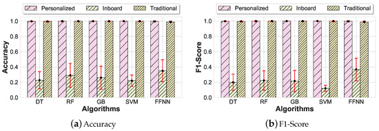 To evaluate their performance in recognizing the activities performed by the participants, specifically the exercises they executed, a comparative analysis between various algorithms was conducted. After an extensive literature review, it was analyzed that tree-based algorithms supporting vector machine and neural networks are the most commonly used classifiers for Human Activity Recognition (HAR) tasks [29,30]. Therefore, in this work, we propose the evaluation of several algorithms, including a Feed Forward Neural Network (FFNN) [31] as a DL approach, and traditional ML methods, such as Decision Tree (DT) [32], Random Forest (RF) [33], Gradient Boosting (GB) [34], and Support Vector Machine (SVM) [35]. Given the nature of the data collected and the objectives of this study, the analysis focused not only on the accurate classification of exercises, but also on assessing the adaptability of the models to new data. With multiple study participants, three key aspects were explored, which we, respectively, called Personalized, Traditional, and Inboard Learning, as listed below.